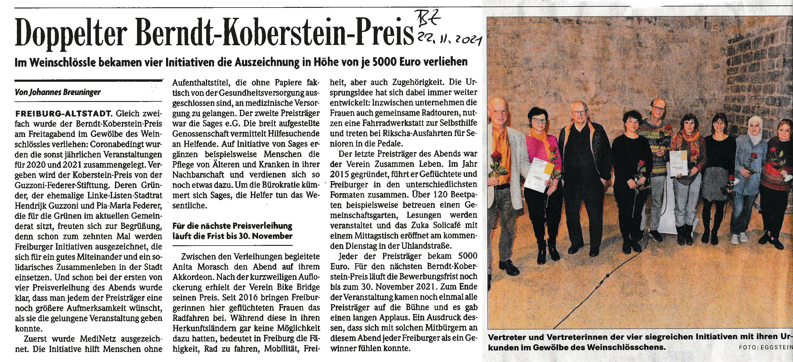 Die Dotierung des Berndt Koberstein Preises wurde von 10.000 € auf 15.000 € erhöht. Im Jahr 2024 geht der Preis ausnahmsweise an drei Initiativen: „Omas gegen Rechts e.V.“, „Solidarischer Weinberg“ und „Bauernhoftiere für Stadtkinder e.V.“ erhalten je 5.000 €.